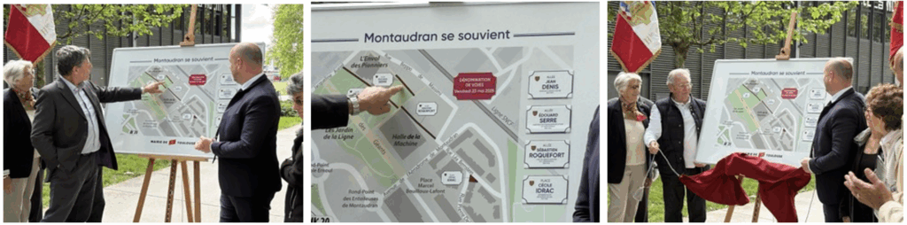 Jean-Luc Emilion Esnault, Maire des quartiers du Pont des Demoiselles, Ormeau, Montaudran, La Terrasse, Malepère, Francis Grass, Adjoint au Maire de Toulouse en charge de la Culture et Thierry Sentous Conseiller Municipal, ont baptisé de nouveaux lieux de Montaudran le 23 mai 2025.