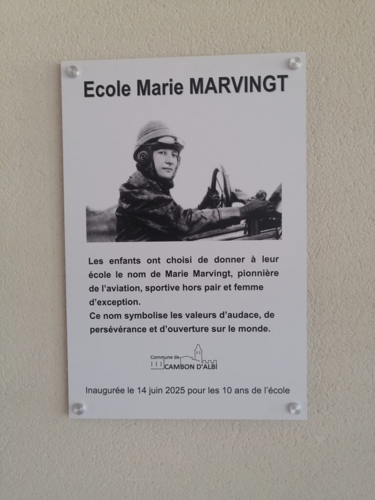 L’école de Cambon dans le Tarn a fêté ses 10 ans le 14 juin 2025 et s’est vue attribuer à cette occasion le nom d’une femme hors du commun : Marie Marvingt, choix des enfants de l’école élémentaire parmi les trois sélectionnées, Joséphine Baker et Colette. Surnommée la fiancée du danger, pionnière de l’aviation, sportive émérite, alpiniste renommée, Marie Marvingt a accompli de nombreux exploits tout au long de sa vie.
