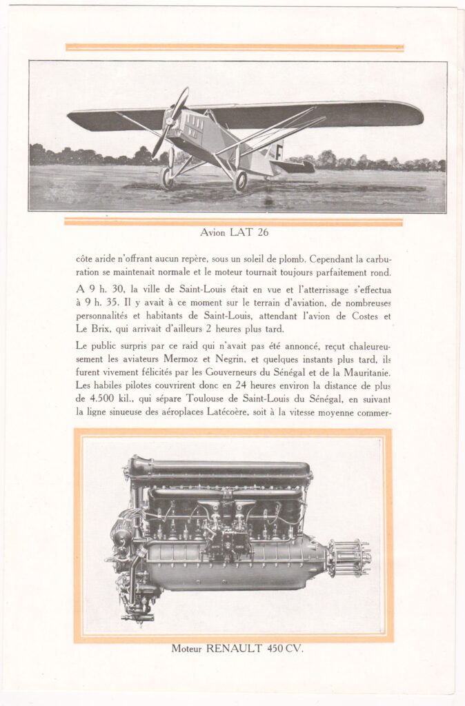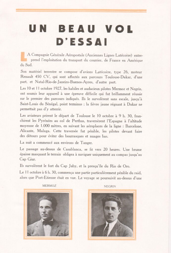 Vous trouverez ci-dessous une fiche récapitulative sur la vie d’Elisée NEGRIN ainsi que le recit détaillée du premier vol direct sans escales entre Toulouse et Saint-Louis du Sénégal avec Jean Mermoz.