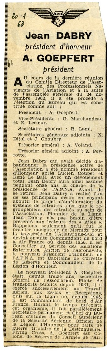 Le commandant Dabry compte 25 ans d’activité sur les lignes de l’Atlantique. A ses amis et aux journalistes venus l’accueillir à Orly au terme de son dernier vol, il déclara : « J’ai 37 ans de navigation maritime et aérienne, j’ai parcouru plus de 4 millions de km. Je suis heureux, au cours de ma longue carrière, de n’avoir jamais égratigné personne et de n’avoir pas même crevé un pneu. Si j’ai pu mener à bien cette carrière, c’est grâce aux équipes de l’air et du sol avec qui j’ai toujours travaillé en collaboration étroite ».